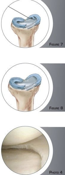 Si la lésion n’a aucune chance de cicatriser, la partie abimée du ménisque est enlevée car elle n’est plus fonctionnelle et ne fait que provoquer la gêne : il s’agit de la méniscectomie. Celle-ci se fait à minima par des petites pinces en gardant toute la partie intacte du ménisque et en évitant autant que possible de l’enlever complètement (figure n°7 et n°8, photo n°4).