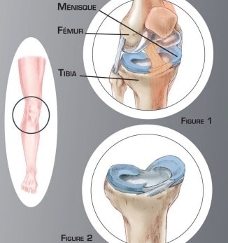 Le genou correspond à l’articulation entre la partie basse du fémur et la partie haute du tibia. Les surfaces de glissement sont recouvertes de cartilage. Les ménisques sont des petits coussinets en forme de croissants situés entre le cartilage du fémur et celui du tibia. Il existe deux ménisques dans chaque genou : un ménisque interne et un ménisque externe. (Figure 1 et 2).