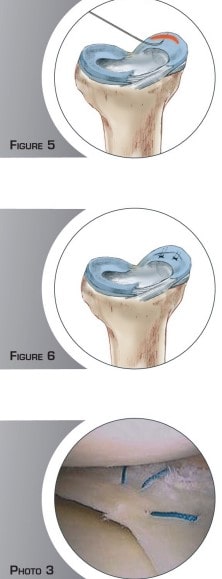 Si la lésion peut faire espérer une cicatrisation, une suture méniscale est réalisée, ce qui permet de garder l’intégralité du ménisque. Un ou plusieurs fils chirurgicaux sont passer dans la lésion (figure n°5) et nouées entre eux pour refermer la lésion sur elle-même (figure n°6), sur le même principe que des points de suture réalisés sur la peau. Ils permettent de stabiliser la lésion méniscale, le temps que celle-ci puisse cicatriser (photo n°3).
