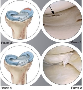 Une lésion méniscale peut subvenir lors d’un traumatisme du genou ou à la suite de petits traumatismes répétitifs subits lors de certain mouvement. Cette lésion peut toucher une partie plus ou moins importante du ménisque. Elle peut être stable (figure 3, photo 1) ou instable se présentant sous la forme d’un bâton de cloche qui bouge dans l’articulation (figure n°4, photo n°2).