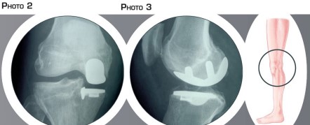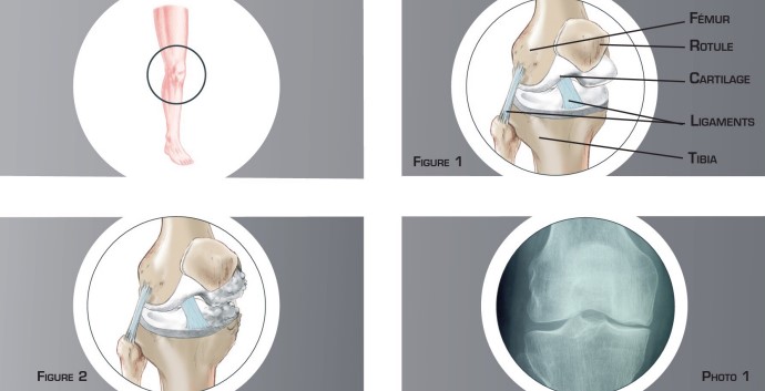 L’arthrose est l’usure du cartilage présent au niveau des surfaces de glissement. Cette usure s’accompagne aussi de remaniements de l’os sous- jacent. Elle peut toucher la totalité ou simplement une partie du genou (figure n°2, photo n°1). Ces modifications occasionnent des douleurs au niveau du genou ainsi qu’un enraidissement et une difficulté à la marche nécessitant l’utilisation importante d’anti-inflammatoires, d’anti-douleurs et parfois même d’une canne.