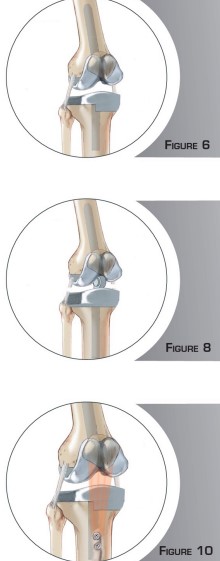 L’utilisation de cales métalliques fixées à la prothèse, voire une greffe osseuse peut s’avérer nécessaire pour le bon positionnement de la nouvelle prothèse. La bonne tenue prothétique est renforcée par un ancrage supplémentaire par des tiges d’extension au sein du fémur et du tibia (Figure n°6 et 7).