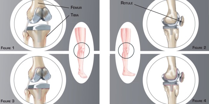 La prothèse totale du genou est constituée de quatre pièces. La pièce rotulienne et une pièce intermédiaire plastiforme qui s’articule entre le fémur et le tibia permettant le bon coulissement de la prothèse (figure 1 et 2) La stabilité de la prothèse est assurée par les ligaments qui sont des sortes de rubans plus ou moins élastiques qui relient le fémur au tibia. Le fonctionnement de la prothèse est assuré par l’ensemble des tendons reliant les muscles à l’os notamment l’appareil extenseur formé par le quadriceps, la rotule et le tendon rotulien.
