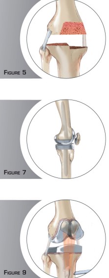 Le but de l’opération est de retirer l’ancienne prothèse, et de la remplacer par une nouvelle. On reprend habituellement la même cicatrice utilisée pour l’implantation de la première prothèse. Un passage est réalisé par la suite à la partie interne de la rotule pour accéder à la prothèse. Après l’extraction des implants défectueux, tous les débris de l’usure sont nettoyés. De nouvelles recoupes en zone osseuse saine sont alors réalisées. L’os du fémur, du tibia et de la rotule sont préparés pour recevoir la nouvelle prothèse (Figure n°5).